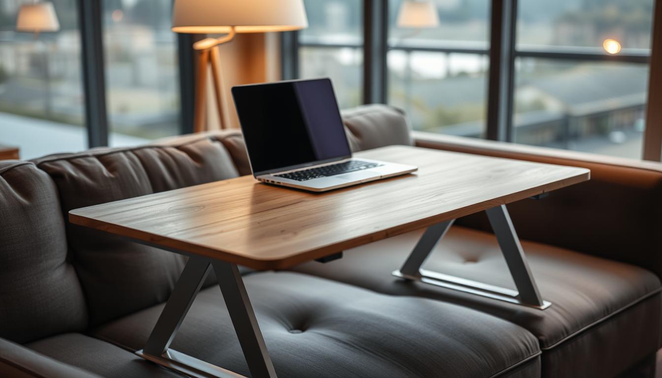 A cozy living room scene with a modern gray sofa, a sleek portable laptop desk resting on the armrest, and a warm, natural lighting filtering through large windows. The laptop desk features a smooth wooden surface and a minimalist metal frame, perfectly positioned for comfortable use while lounging. The room's neutral palette is accented by a few plush pillows and a stylish area rug, creating a welcoming and relaxing atmosphere ideal for productive laptop work.